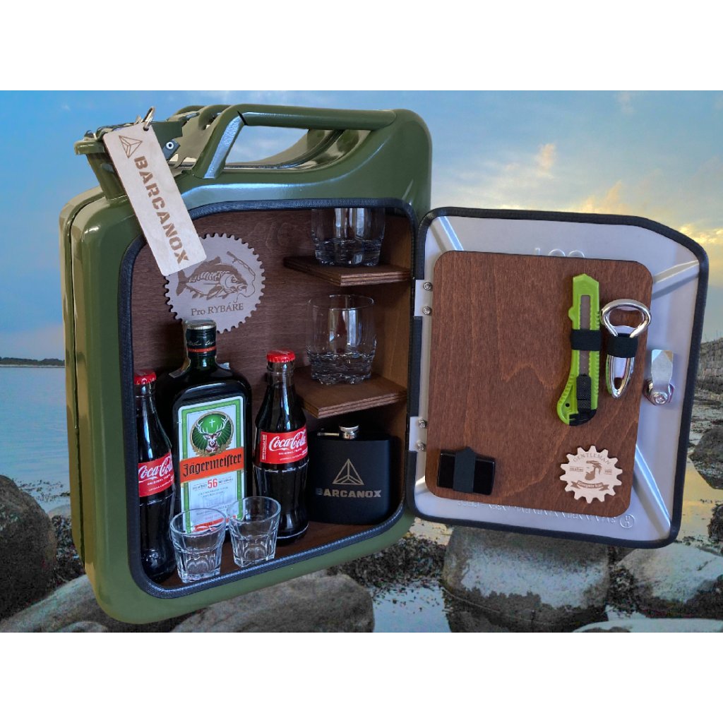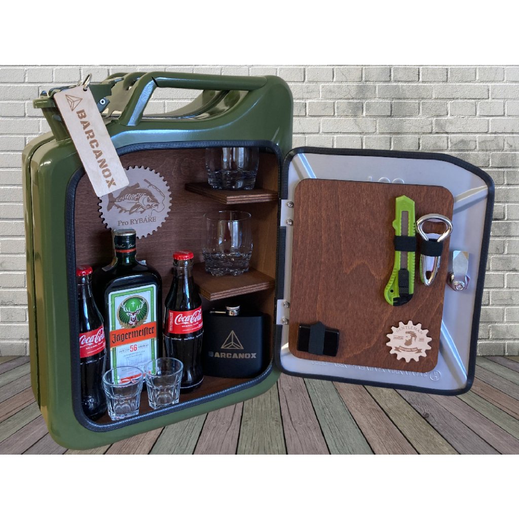 Na suchu jen tak neskončíte! Bary vyrábíme z klasických 20 l vojenských plechových kanystrů. Po vyložení dřevem a vložení doplňků je v něm stále místo až na 3 lahve. Pohodlně se do něj vejdou lahve piva, vysoké lahve vodky, rumu nebo široké lahve Jägermeistera. Na poličku dáte několik panáků nebo nízkých whiskovek. Dvířka si můžete po rozbalení osadit zapalovačem a dvěma doutníky.